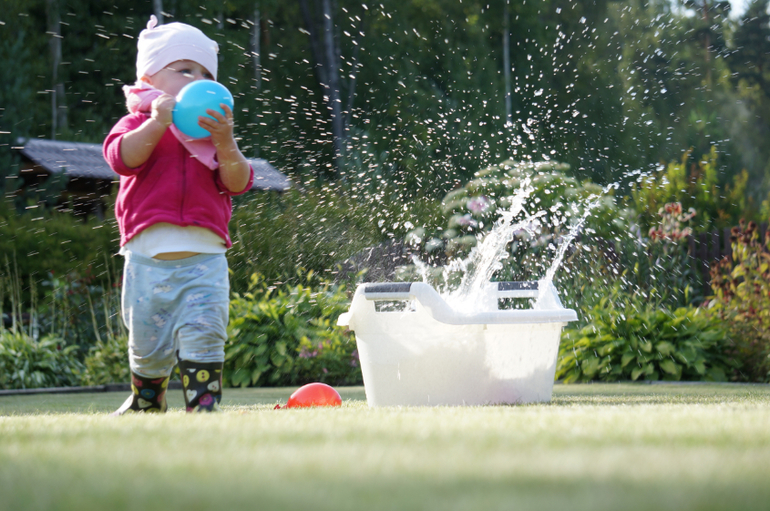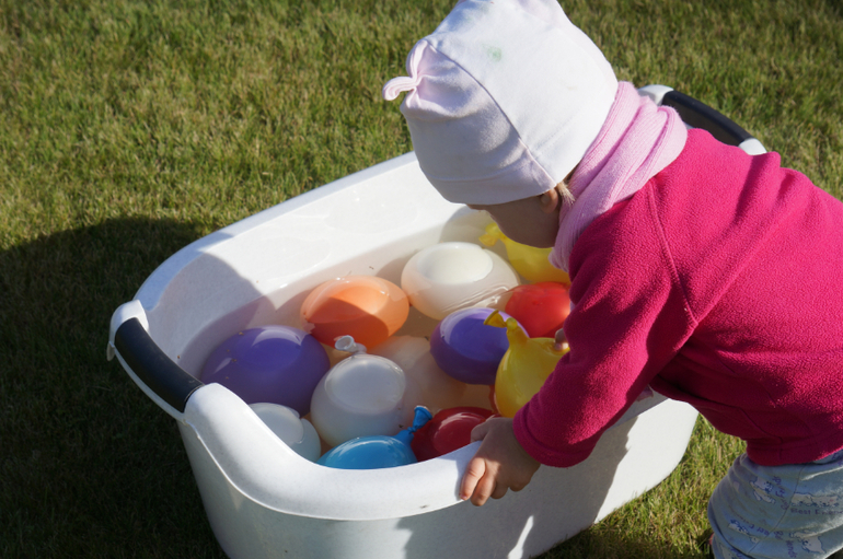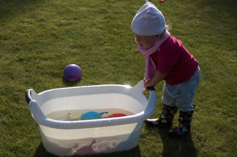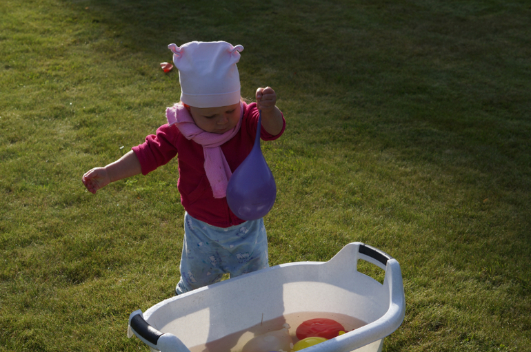Развитие детей второго года жизниОчень увлекательное веселье можно устроить с воздушными шарами, наполненными водой, и погруженными в таз или ванну! Куча брызг, шаров-писунов, игр на меткость, на знание цвета, да и просто душевный смех всей семьи вам гарантирован! Ловите лето или играйте дома в ванне!