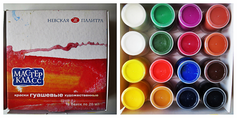 Как-то удивительно, но этап с гуашью мы проскочили и сразу от пальчиковых красок перешли к акварели, дочка сразу запомнила последовательность макания кисти вода-краска-бумага. Но все же гуашь мы купили. Я считаю что материалы для творчества должны быть качественными, поэтому и гуашь мы купили на мой взгляд одну из лучших, от "Невской палитры". У нас набор из 15 цветов (в наборе баночек 16, так как белил 2 банки) по 20 мл., небольшие.
