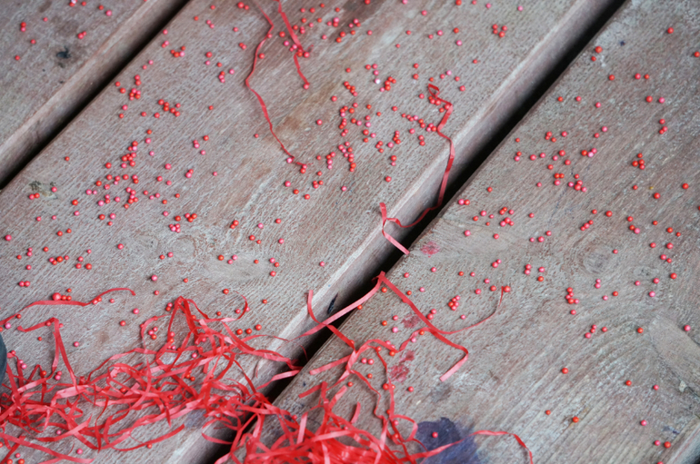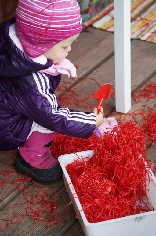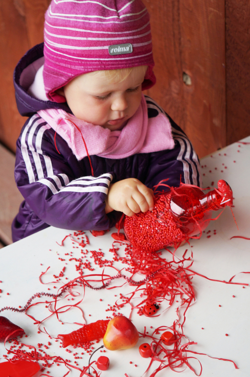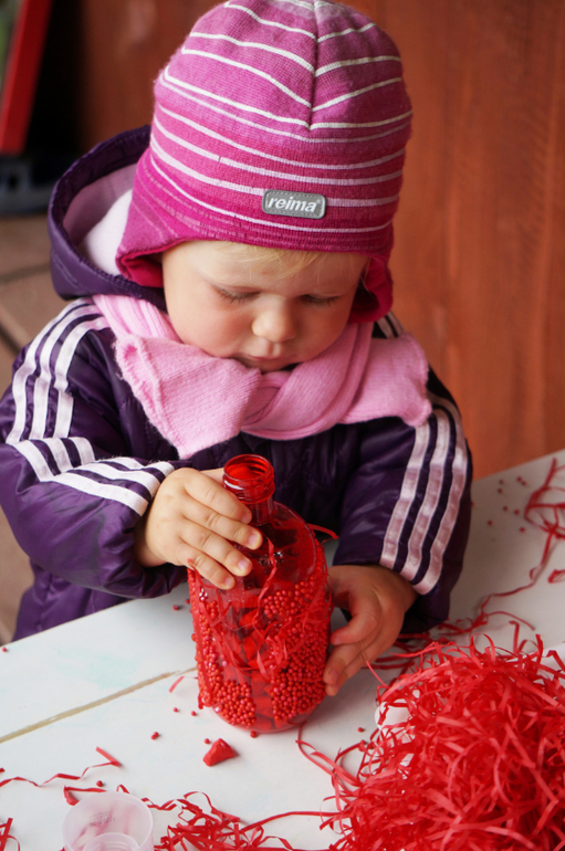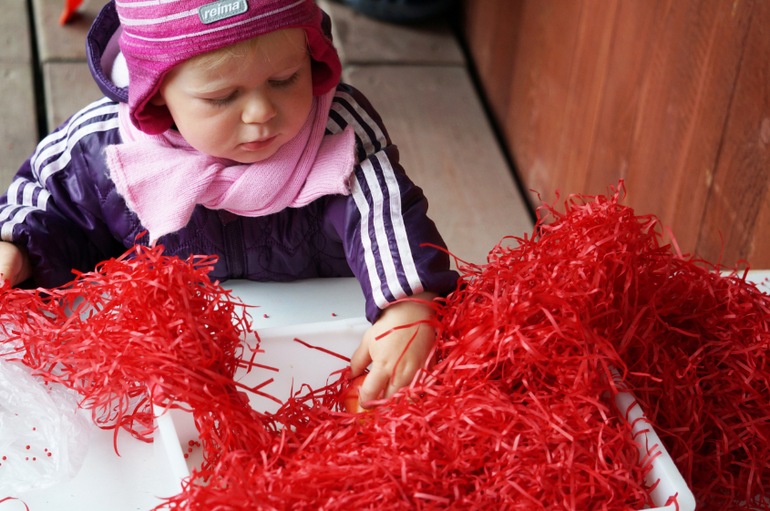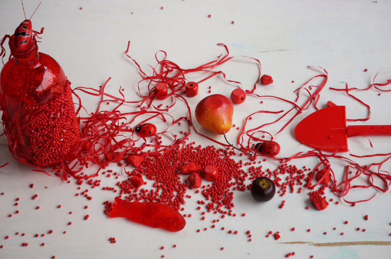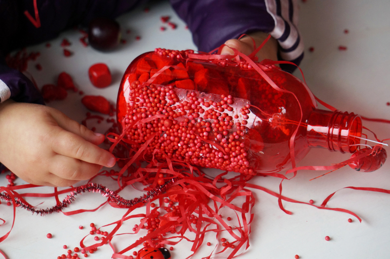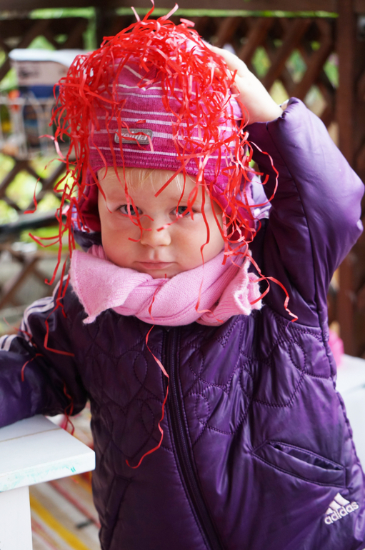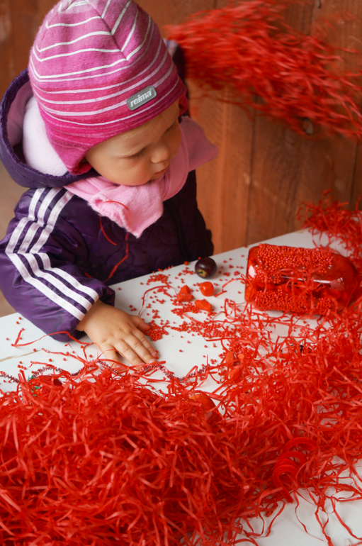 Развитие детей второго года жизниПродолжаем учить потихоньку , ненавязчиво так, в форме игры и развлечений. На этот раз зашла в магазин швейной фурнитуры и накупила кучу красных штучек от упаковочной волосатой бумаги и мягких шариков до яблочек, груш и жучков. Больше всего Машу впечатлила красная бутылка, внутри которой были красные камни, а снаружи мелкие шарики - она с ней долго возилась! А еще мы делали парики из бумажек! Такой вот получился красный день календаря!