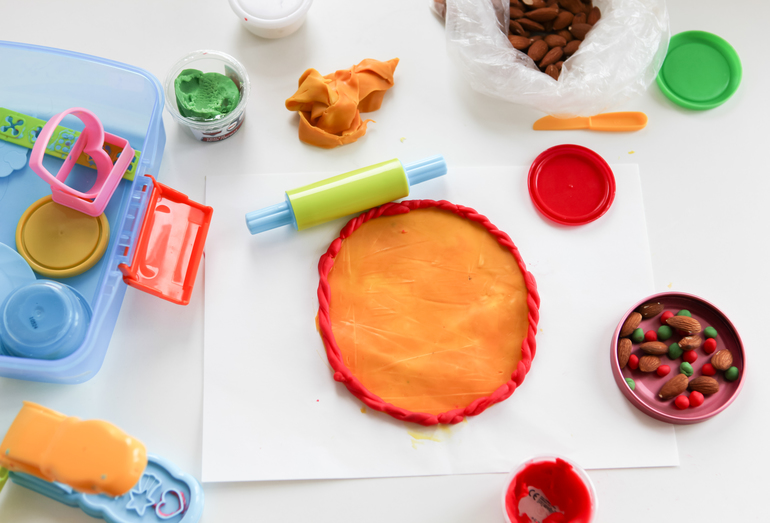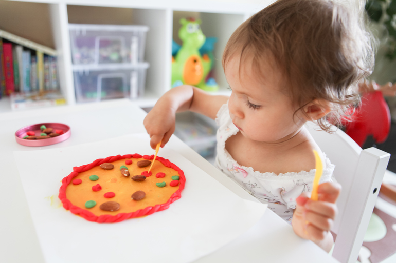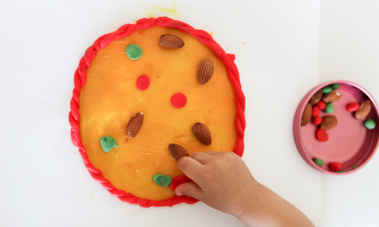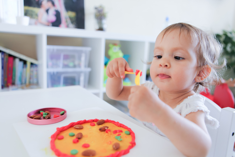 Я раскатала "тесто" и сделала вот такую заготовку для пиццы. Косичку для оконтовки мы вместе выдавливали из пресса. Из оставшегося пластилина я скатала шарики, насыпала немного миндаля и предложила Машуле всем этим украсить нашу "пирог". Эта идея пришлась ребенку по вкусу. Она старательно лепила, а потом с удовольствием "пробовала" свой шедевр. Вот такое вкусное творчество.