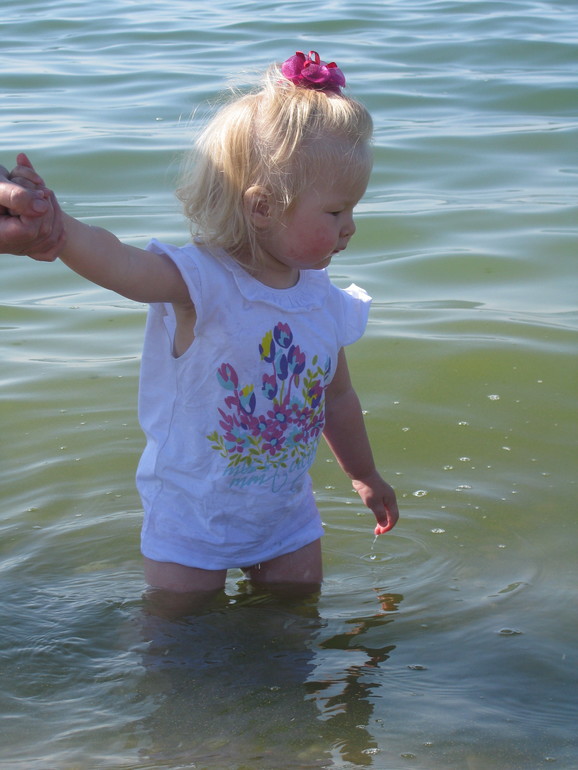 Марианна воды не боится, бежит в воду с разбега, визжит от восторга и еще ей надо туда где глубже...