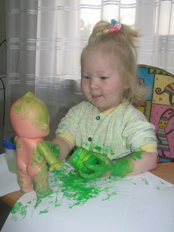 Так мы закрепляли и повторяли ЗЕЛЕНЫЙ цвет, но одной Марианне заниматься скучно, поэтому на помощь пришла Катерина. После занятий отмыла в ванной и Марианну и Катерину.