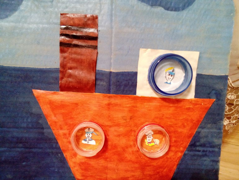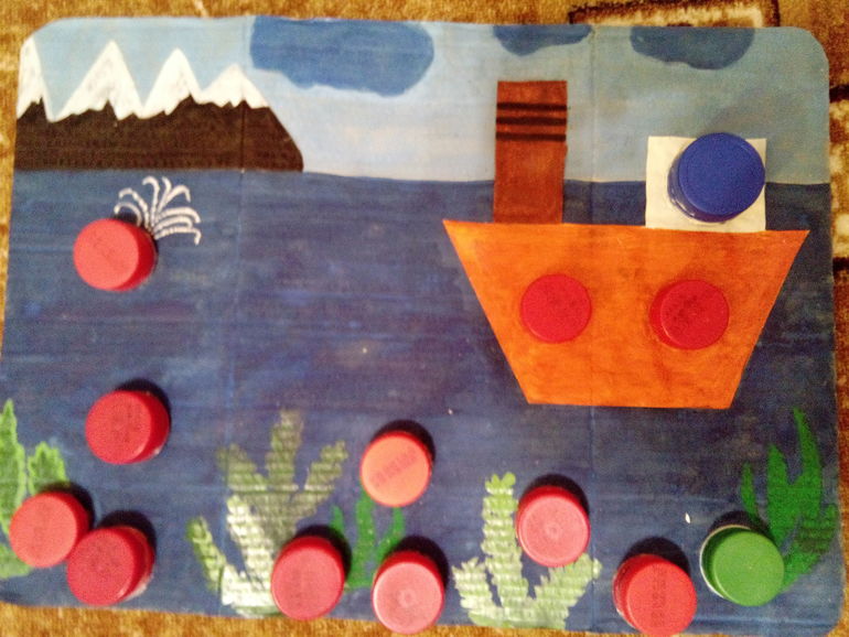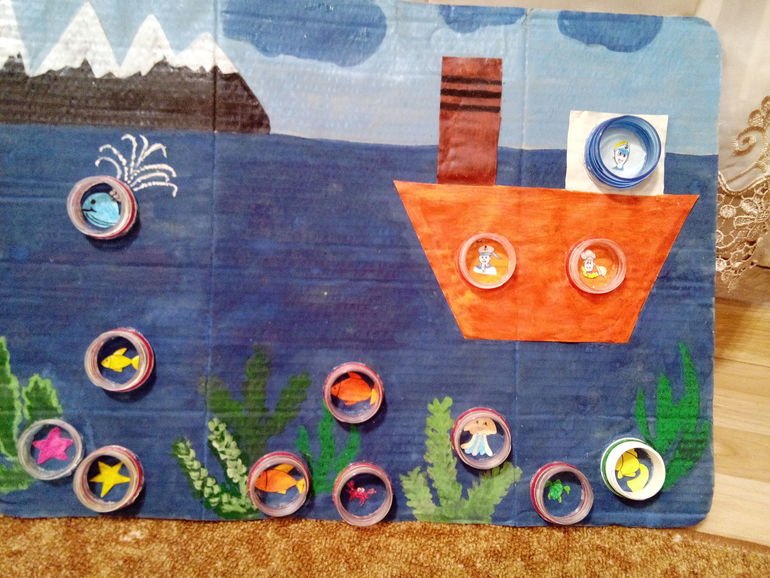Есть у нас город из крышечек, в планах было сделать еще и море и вот что получилось....
