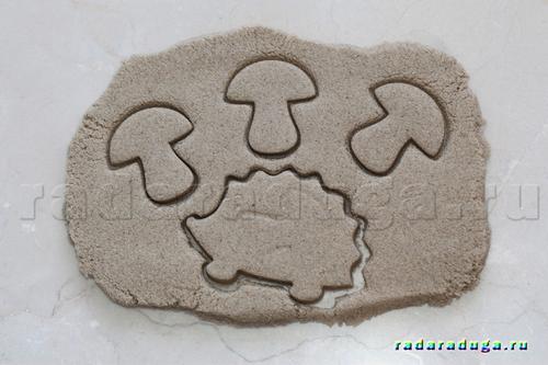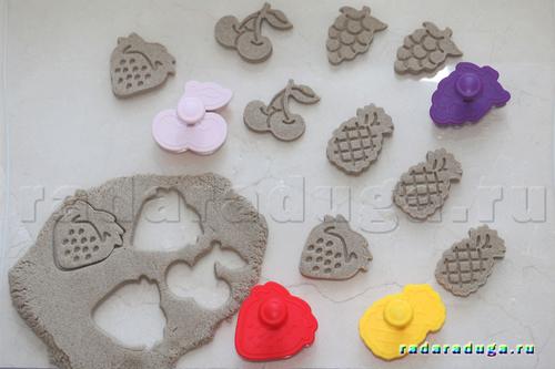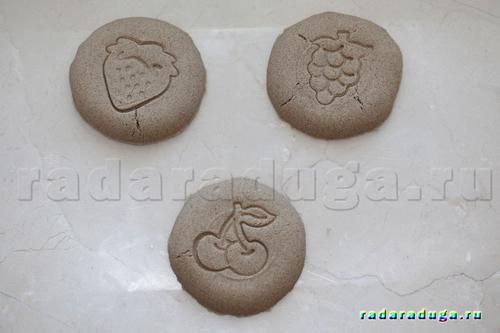 Вырезали формочками с печатью ещё ягодок и фруктов. Я всегда, покупая формочки для печенья, приобретаю 2 набора - для съедобного и несъедобного :) Первый - для печенек, украшения тортов. Второй - для песочка, пластилина, соленого теста.