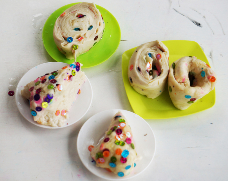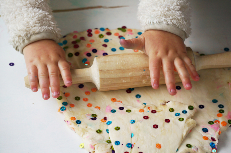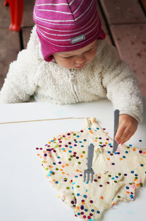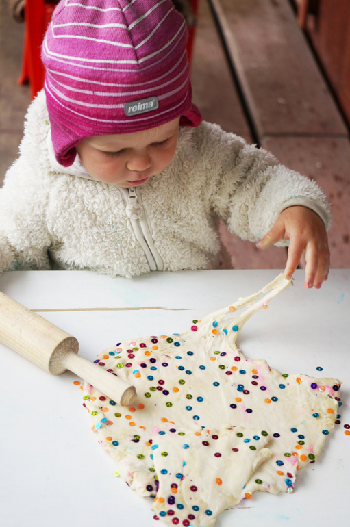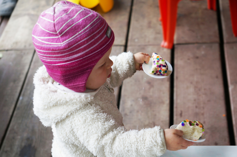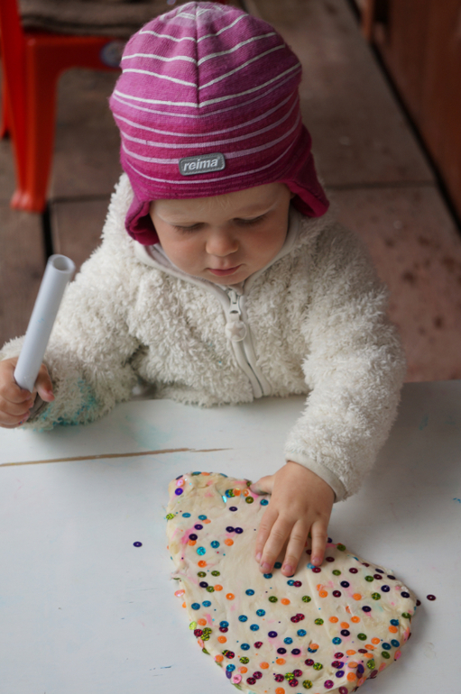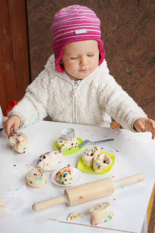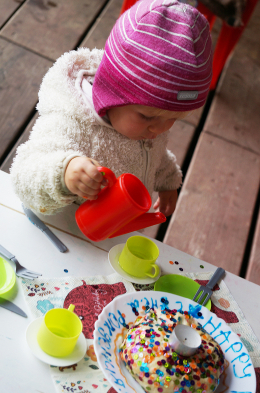 Развитие детей второго года жизниМы с Машей давно угощаем кукол желе, устраиваем им чаепитие с пирожными, кормим мороженым, лечим их, а вот недавно был папин день рождения, и чтобы тема была свежа и актуальна, то мы устроили день рождения куклы Кати. Я заранее подготовила из теста (мука, вода, масло растительное) и пайеток торт, мы накрыли стол, поставили букет цветов, одели всем колпачки, зажгли свечу и начали праздновать! А потом все пошло в обратном порядке: раскатывали тесто, крутили булки, выпекали в духовке! Праздник удался на славу!