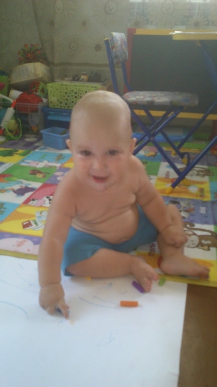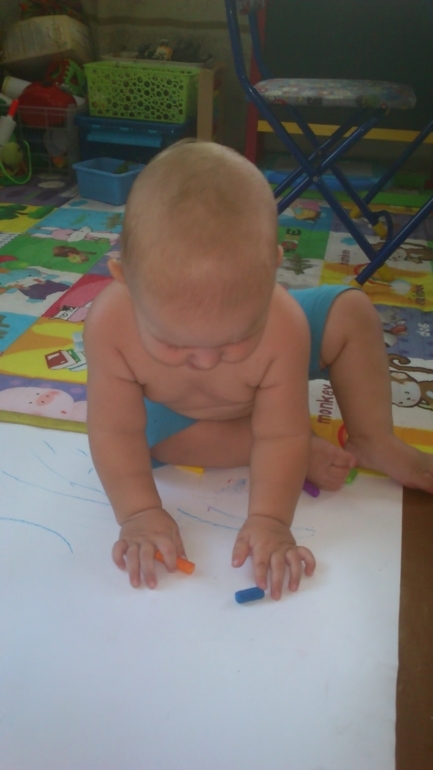 Как ни странно любимым материалом для рисования у Даньки являются восковые мелки! Их и погрызть удобно, и порисовать, и в маму кинуть)
