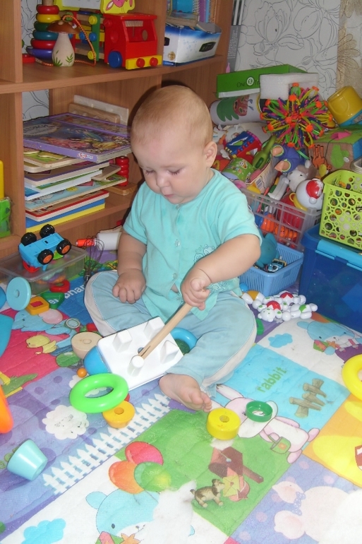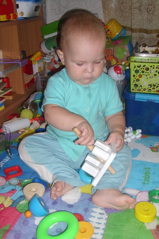 Еще одна игра на развитие моторики и координацию движений: нужно вставить палочку в отверстие. В данном случае это палка от пирамидки и основание от геометрического сортера.