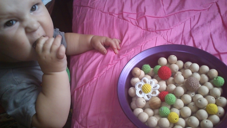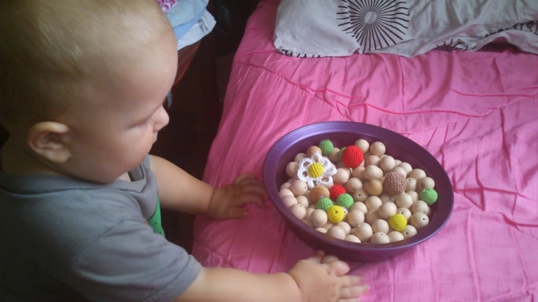С деревянными бусинами игр у нас много. К ним мы добавляем еще пампоны и пластиковые шарики. Для разнообразия тактильных ощущений