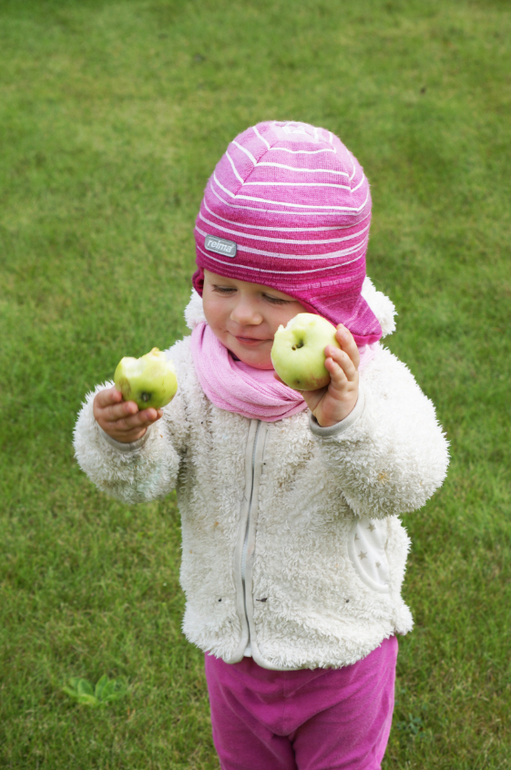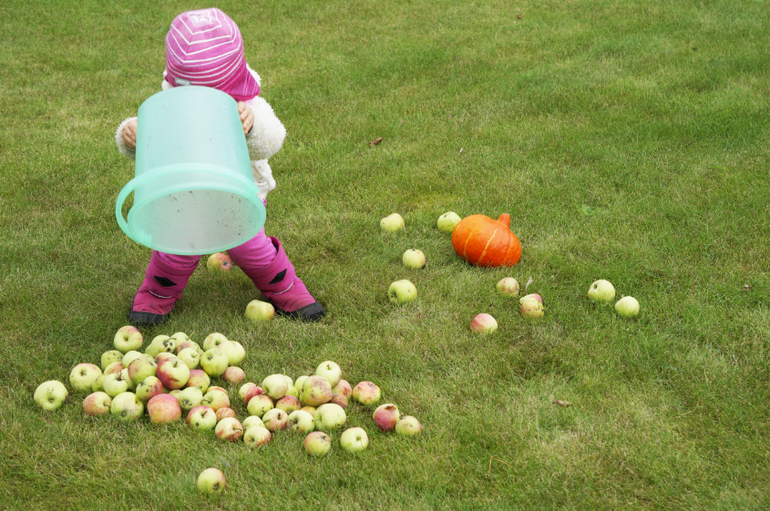 Развитие детей второго года жизниСильный ветер повалил множество яблок с дерева, мы с Машей пошли собирать их в ведро, и тут все превратилось в игру. Сначала мы просто развалили яблоки на лужайке, пробовали их, изучали понятия большой-маленький, кислый-сладкий, а потом начали фантазировать, что же можно сотворить из яблок, ведь у нас уже были опыты с огурцами, деревьями, забором? Не зря у англичан есть пословица An apple a day keeps a doctor away - По яблоку в день и нет нужды в докторе! Такой вот вышел спонтанный яблочный день!