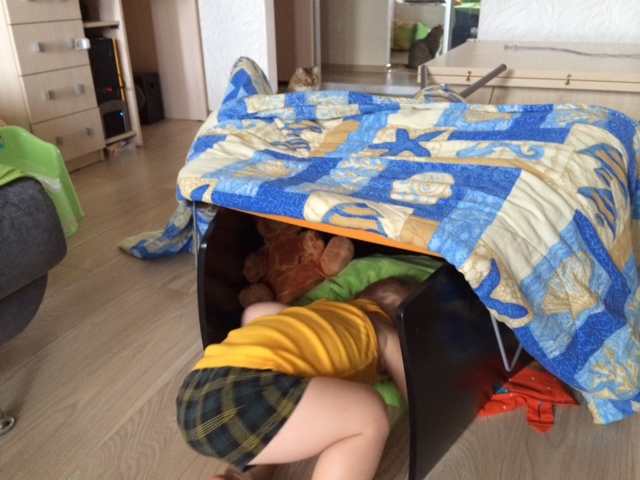 в общем на берлоге мы подзастряли и играли долго. Потом ее частично разобрали, но полностью Дима не дал, и продолжил в нее залазить и вылазить многочисленное количество раз: