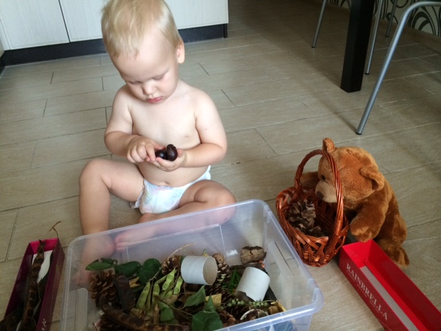 После сна уже без настройки мы играли в сенсорную коробочку (семена-стручки, шишки, каштаны, орехи, листья, пустые улитки, крашенный зеленый рис, мелкие игрушки на лесную тему: заяц, лиса, енот, медведь правда белый):