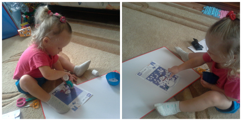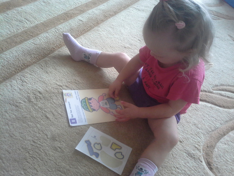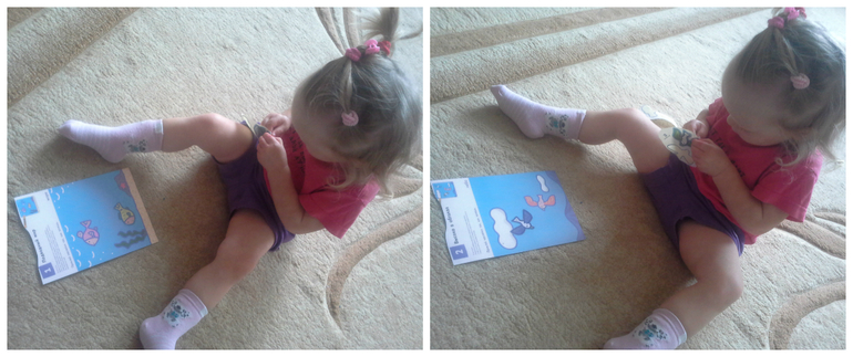 Так как Ульяна давно знакома с наклейками, и аппликация клеем для неё не нова, начали мы с тетради «Давай клеить». По моим предположениям, с 70 % заданий Ульянка должна была справиться без проблем. Так и получилось.