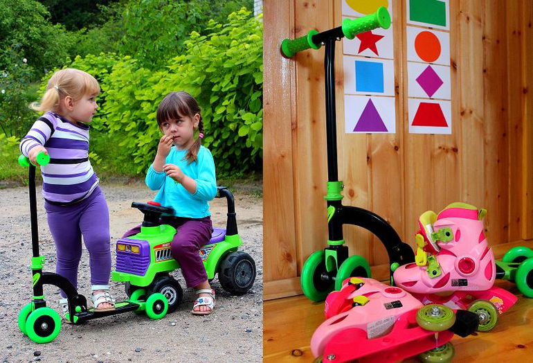 Физическое развитие должно занимать в жизни малышей важное и почетное место. Летняя пора - это простор для фантазии родителей, как сделать каждодневную зарядку нескучной, без принуждения и уговоров. Для нас в этом году отличным "стимулятором" стали самокат и ролики. О роликах скажу так: в 2 года - это просто милое дополнение к уже имеющемуся транспорту ребенка))) Стоять на них - без проблем, кататься в доме или по квартире - без проблем, но на улице, конечно, еще рановато, хотя удовольствия доставляет немало... ребенку))) А вот самокат - в самую точку, я думаю, что даже раньше двух лет можно начинать кататься, так как мы стали на него в два так, как будто катаемся уже на нем минимум полгода, то есть стала и поехала без поддержки, страховки и страха. В нашем самокате можно установить любую комбинацию колес, то есть можно 4 одновременно, 2 одновременно, 2 спереди/1 сзади или 1 спереди/2 сзади. Пока катаемся на четырех.