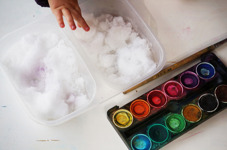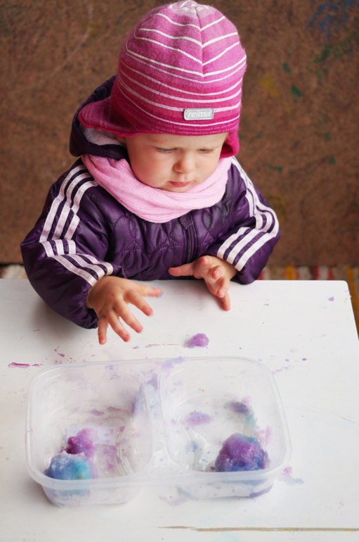 Развитие детей второго года жизниУ меня на даче стоит старый советский холодильник, и его нужно (о, ужас) размораживать! Даже не верится, что какой-то чудо-мастер придумал систему NO FROST, а раньше люди из морозилки доставали полкило снега! И куда его девать посреди лета? Конечно организовать творческий процесс! Мы рисовали на снегу, лепили снежки, кидали на пол, а когда он стал таять, то просто играли с цветом! Так что, и в процессе разморозки холодильника есть ПЛЮС! Ну, а шапка не ради прикола, у нас действительно холодно!