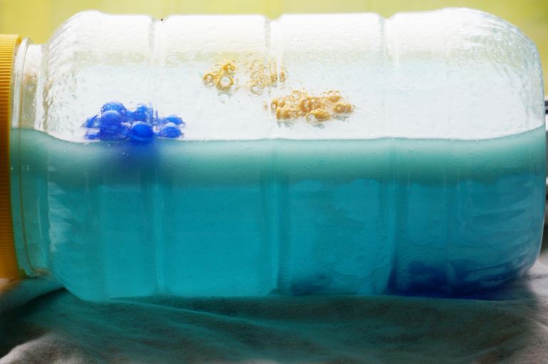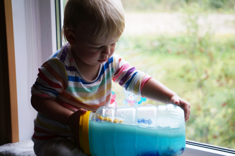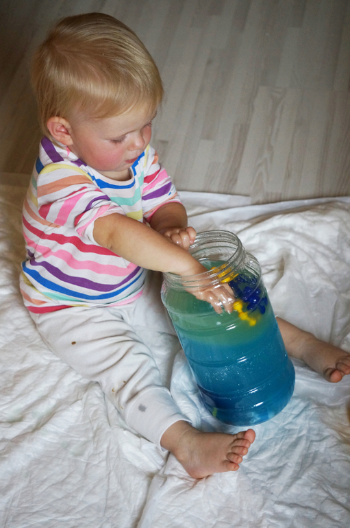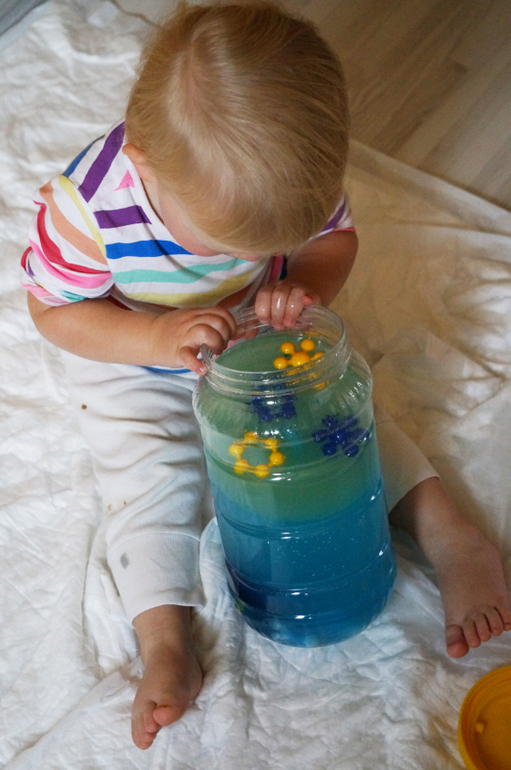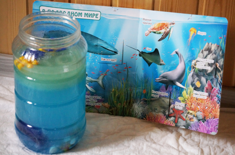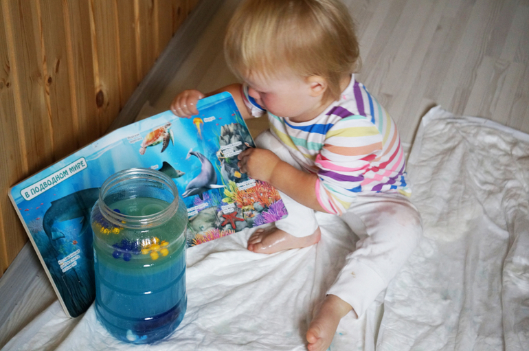 Развитие детей второго года жизниУ чудной златовласки Оленьки много интересных идей и отличные фото, которые вдохновляют пойти и сделать то же самое! Одним из таких занятий стал океан в банке! Мы только с Машей чуть-чуть увеличили формат емкости, а цветовую гамму оставили исходной! Впечатления разные - Ольгина дочка наблюдала за пузырями и любовалась слоями, а моя - засунула руки в маслянистый слой (в банке подкрашенная вода, растительное масло и любые игрушки) и наслаждалась "липким" состоянием даже больше, чем при игре с желе и желатином! Вывод один - надо пробовать, ведь никогда не знаешь, что увлечет малыша!