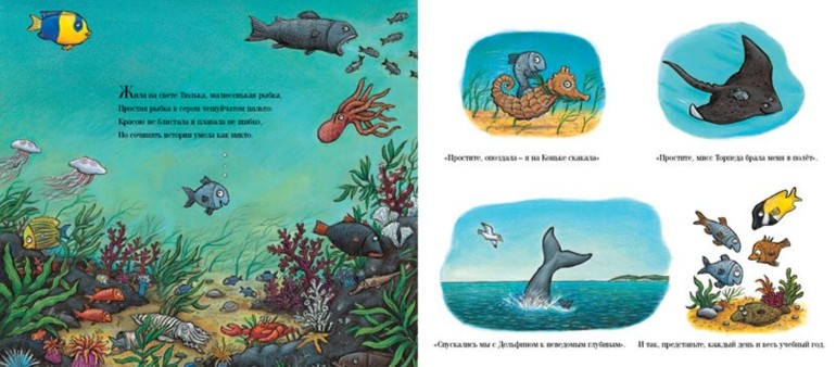 О, я не могу сдерживать эмоций касаемо этой книги. Она однозначно моя любимая!! Как только мы ее купили, я перечитывала ее несколько раз, пересказывала мужу вслух, в общем получила массу удовольствия. Сюжет таков: рыбка все время опаздывает на урок, сочиняя в свое оправдание невероятные истории, пока, однажды, действительно не попадает в одну передрягу, но ее чудом спасают собственные небылицы. В общем, эта история обо всем: и про сплетни, и про непунктуальность, и про обман, и про фантазию. По ходу сюжета ребенок знакомится с большим количеством названий морских обитателей. В общем, всем советую!