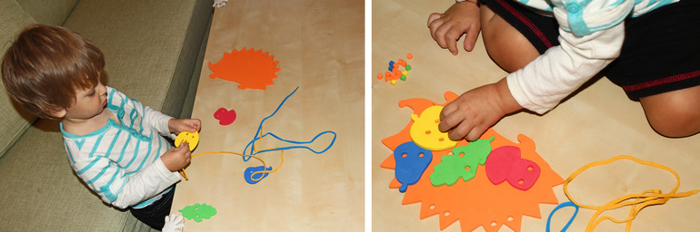 Шнуровка нам не нравится и ежику ничего не досталось, зато сын снова самостоятельно развивал свою моторику. В каждую дырочку вставлял маленькие кружки, которые к счастью не выбросила когда распаковывала набор.