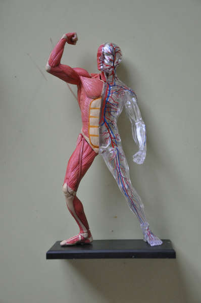 Одна его половина - скелет, а сверху кровеносная система. Вторая - мышцы и связки. Алиса обожает с ним играть, показывает, что не знает, спрашивает про те части, которые еще не запомнила.