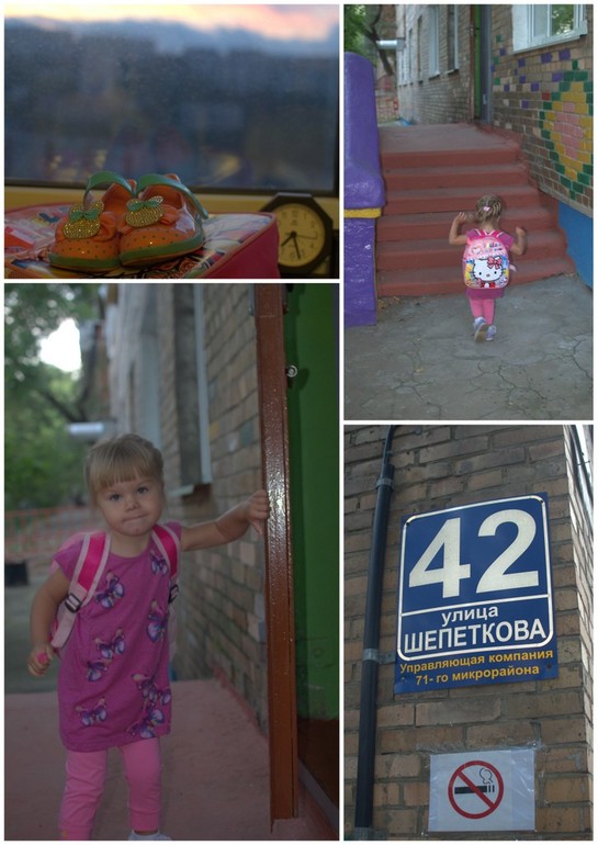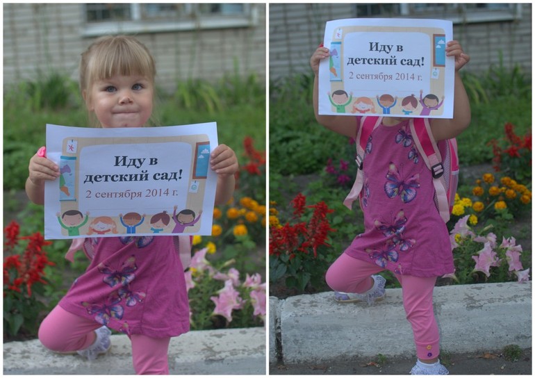 Вот нашелся такой список идей, что можно сфотографировать в этот день. Я их него выбрала подходящее для российских реалий: будильник, садиковская одежда, принадлежности, завтрак, воспитатель, сад, открываем двери сада, ребенок машет рукой, шкафчик, с детьми, группа.
