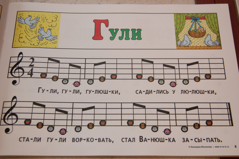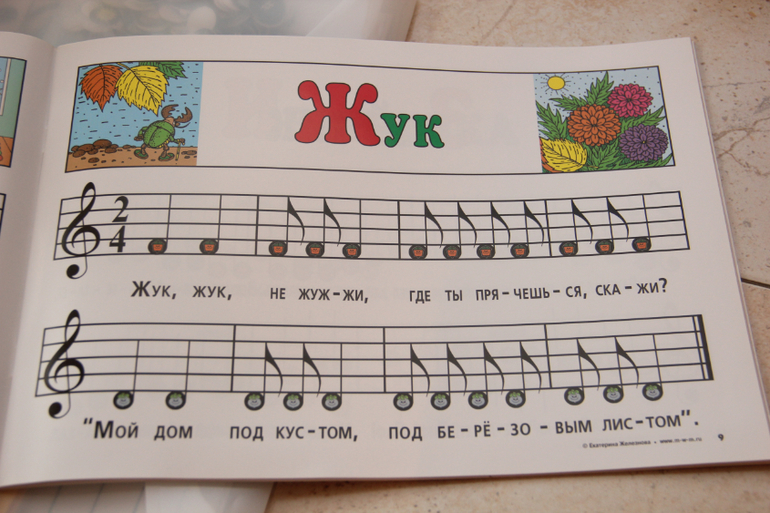 Музыкальная азбука. Там 34 песенки. Есть песенки, которые поются на 1 нотке и надо правильно отбивать ритм, есть песенки уже посложнее. Все нотки обозначены рисунками, поэтому даже такие как я могут сразу что-то "сбацать")))