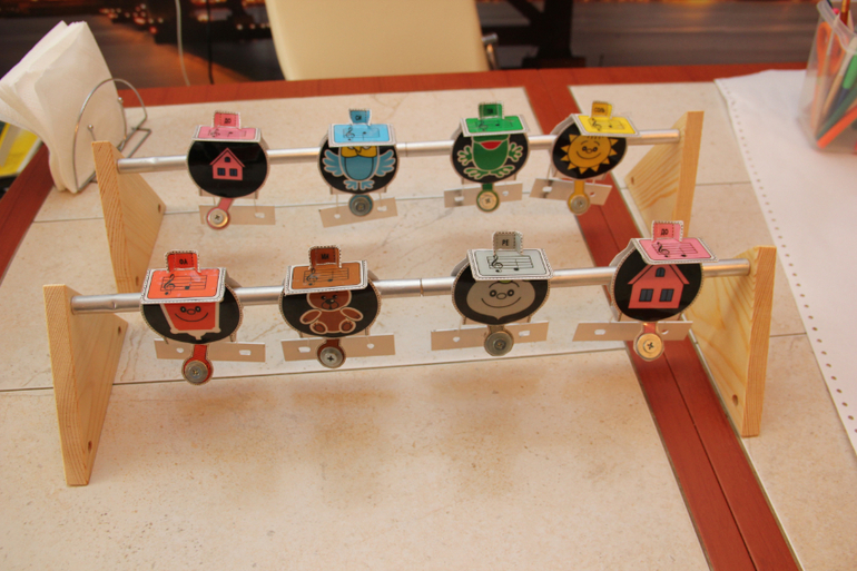 Чем мне понравиась идея ляляфона - большие колокольчики. Миша не любитель стучать по металлофону, синтезатор тоже не понятно как пойдет, а тут он даже без моих усилий, сидит что-то наигрывает)). Итак, это 8 крупных ноток на 2 стоечках.