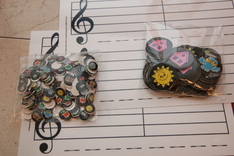 2 ламинированных листа и 2 набора ноток для записи песенок. Маленькие на липкой основе, большие нет.