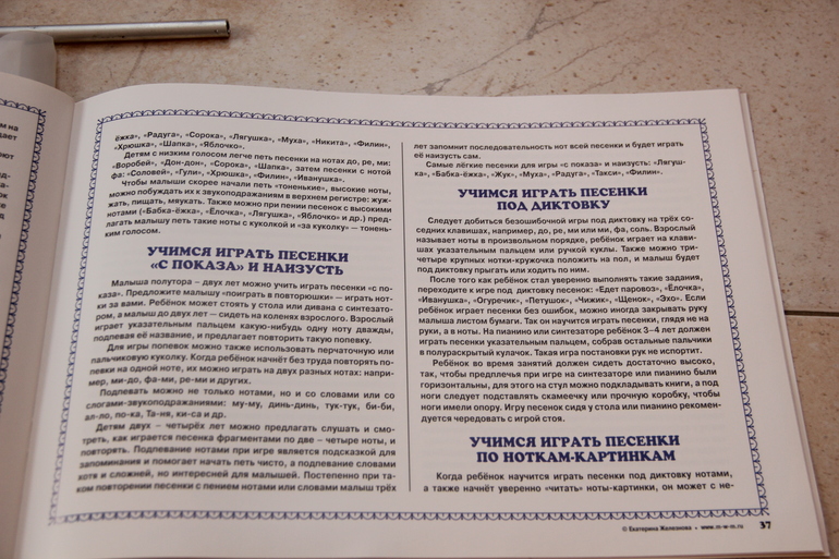 Например, методика Лазарева - мне показалась достаточно сложной и мне показалось, что у меня не хватит времени и терпения все это изучить, смастерить и внедрить. Предлагал Бимбаскет свои готовые наборы с методикой и игрушками, но цена в 2600 руб в месяц + синтезатор+еще что-то там надо было докупать, в общем, как-то не по бюджету. Тем более, что набор игрушек мне был не нужен.