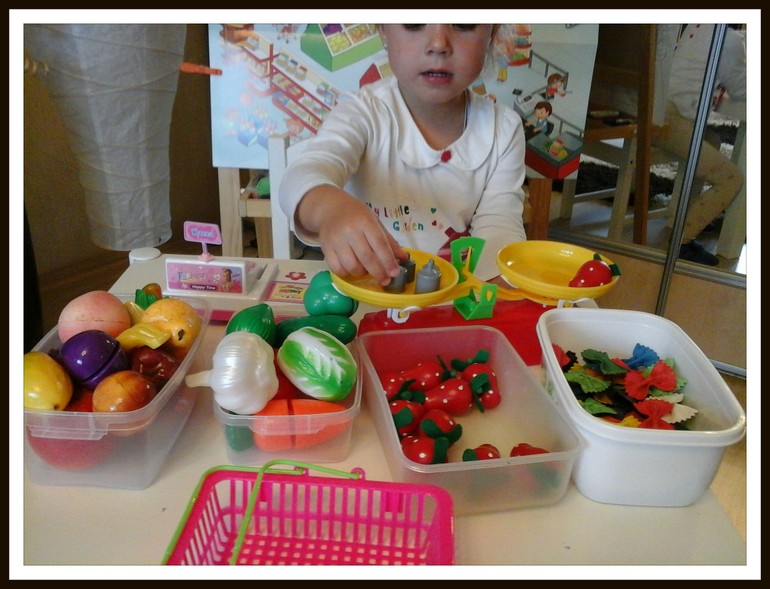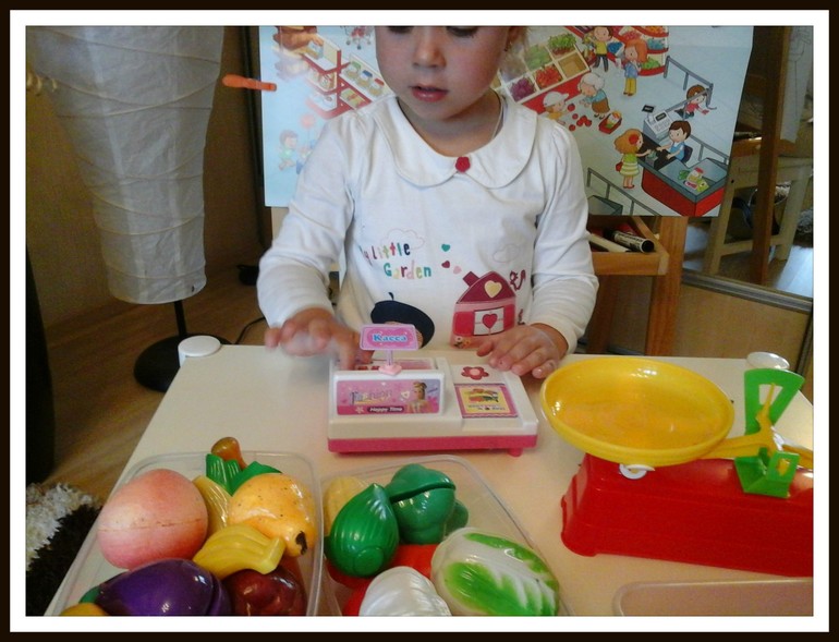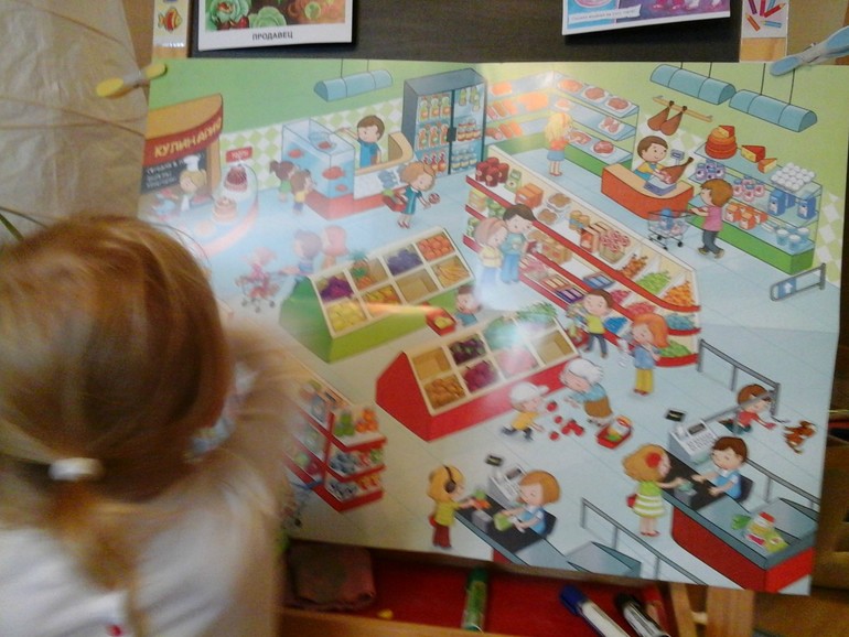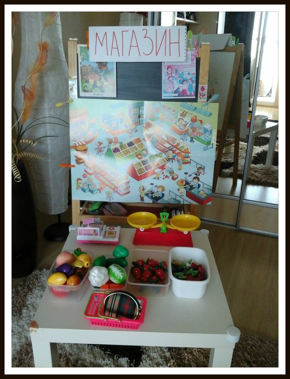 Наигравшись в магазин (товар пришлось завозить в магазин аж пять раз), занялись пособием " Пока "расставляли" все по своим местам, обсуждали отделы, товары, предметы