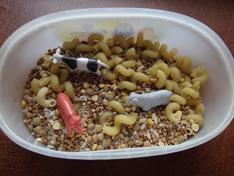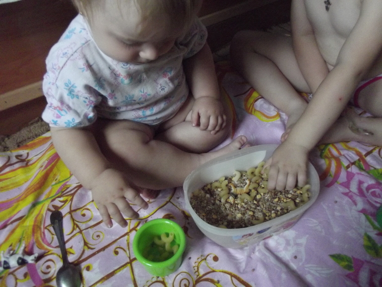 Сенсорные коробочки - делаю из всего.Самая популярная смесь из крупы и макарон.Манку ест.