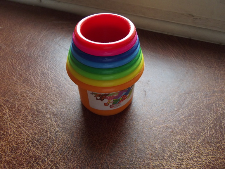 Стаканчики-пирамидка - тут вообще простор для фантазии.Разбираем,собираем,попутно уча цвета.Складываем туда бусины подходящего цвета.