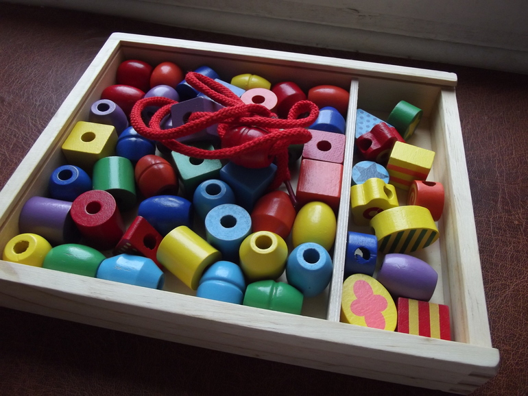Купила я деревянные бусины-шнуровку.Учим цвета,строим из них башенки,раскладываем по стаканчикам...Позже будем учиться одевать на шнурок.
