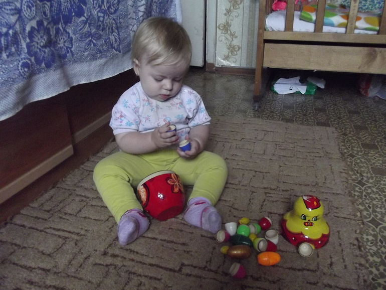 Матрешка с яйцами внутри,подарила моя бабушка.Тоже оказалась полезной штукой.Маша любит вынимать оттуда цыплят,а потом пытается назад собирать.
