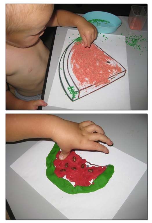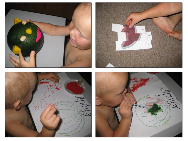 Прочитали стишок, раскрасили разными способами наш арбузный плакат: штампиками-пробками букву А, соломкой раздували кляксы на арбузе. Собрали числовой пазл.