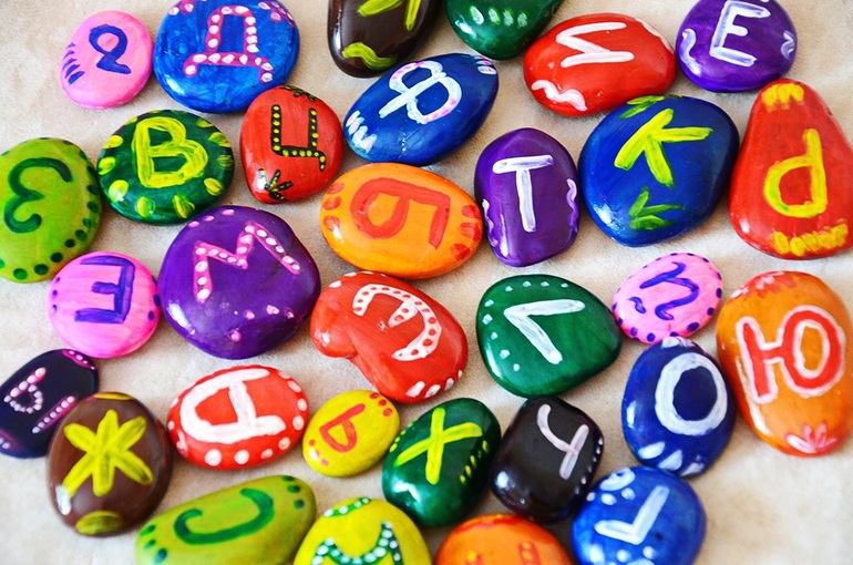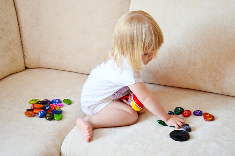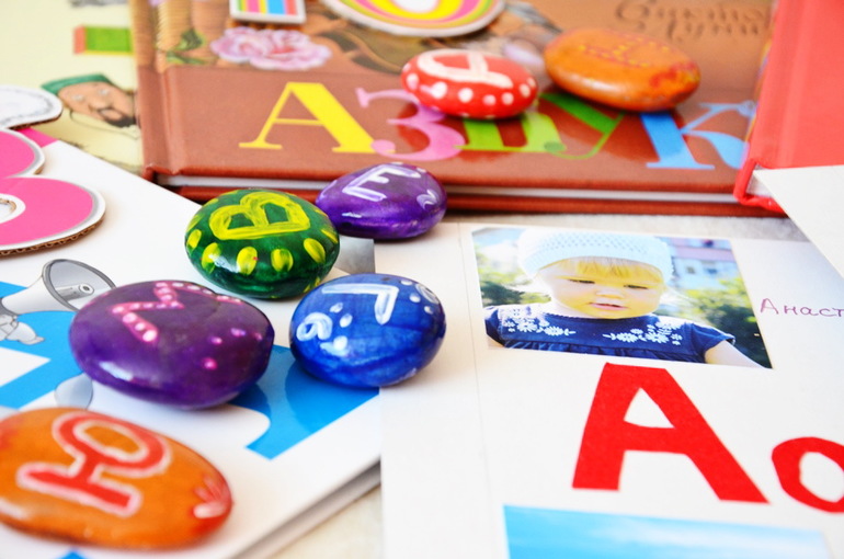 Как и многие, мы сделали себе азбуку на камушках. Гальку раскрасила акриловыми красками и сверху покрыла прозрачным лаком. Потом они некоторое время проветривались на балконе.