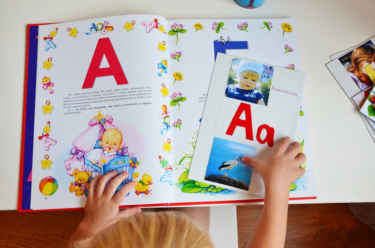 В дополнение к этому букварю мы составляем свою азбуку, используя обычный картон, подборку картинок по буквам и буквы, вырезанные из бархатной бумаги. Настя выбирает картинки, которые ей больше всего понравились - и 2 картинки мы приклеиваем к букве. Когда соберем все странички (это пока еще в процессе) - сброшюрую листы - и получится наша персональная азбука).
