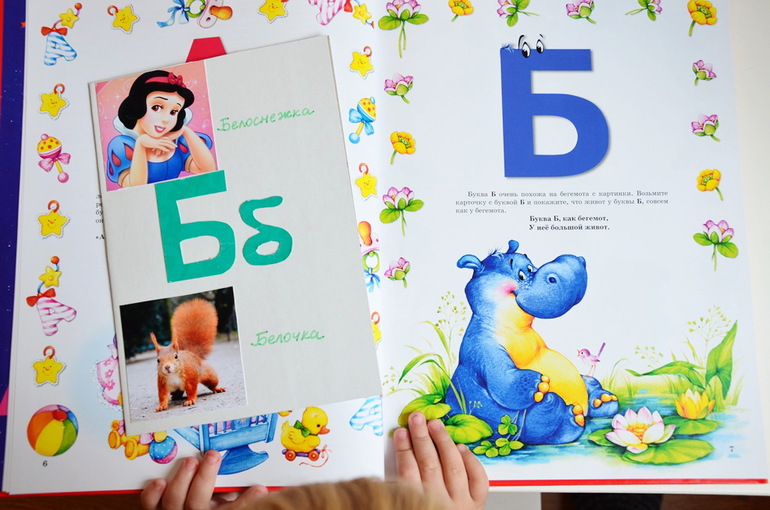 Итак, с чего начать. Как я уже сказала, буквами Настя интересуется лет с двух. До этого времени она запомнила только букву "А" и всячески этим гордилась, но на мое предложение познакомиться с другими буквами она отвечала отказом. Да и вообще если она что-то не хочет - я никогда не настаиваю. Ситуация поменялась с появлением в нашей библиотечке букваря Елены Бахтиной (спасибо за подсказку Ане!) Теперь мы играем с буквами каждый день! И она почти все их знает. Букварь просто очаровательный. И пусть многие картинки могут показаться "не очень", импонирует сама идея дать букве образ. Например, у буквы "Б" - животик как у бегемота, буква "Ё" - с открытыми глазками, а "Е" - с закрытыми и т.д. Насте это очень нравится! Она знакомится с буквами и играет с ними даже лучше, чем с игрушками. Сама придумывает с ними истории. Вот фото букв из букваря Бахтиной. На последней страницы есть буквы, которые можно вырезать и приклеить на картон, впоследствии используя их в игре.