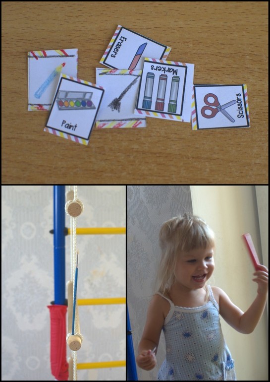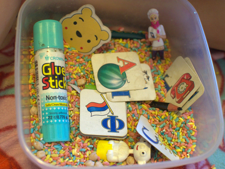 Еще была у нас сенсорная коробка с тем, что может относиться к детскому саду (резинки, карандаши, маленькая посудка, фигурки, буквы). Доставали пинцетом и руками, говорили, для чего, озвучивали буквы (какие-то Алиса сама, какие-то - я).