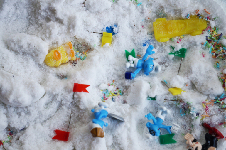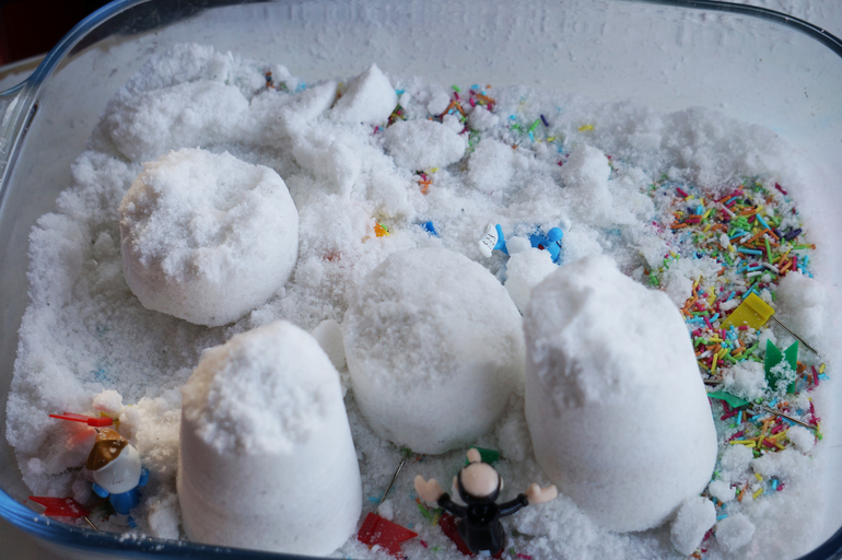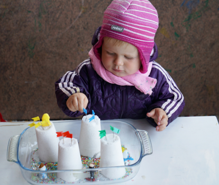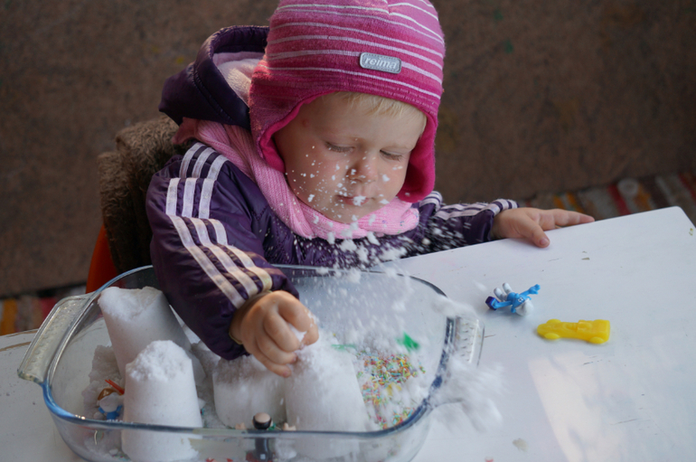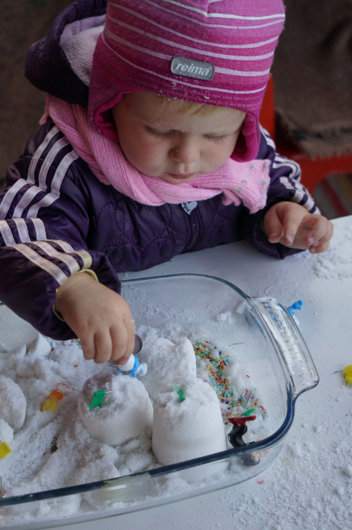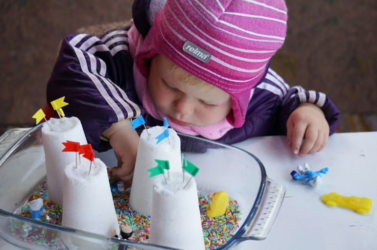 Развитие детей второго года жизниНа страницах ББ многие строят соляные замки, или придумывают какие-то другие формы, а потом раскрашивают. Маша очень любит рисовать, но когда ей для игры предлагаются сыпучести, то о первом мы забываем, тут главное почувствовать материал руками, покидать его...Соляные зАмки вышли из обычных пластиковых стаканчиков, важно взять крупную соль и добавить чайную ложку воды на стакан, а потом сутки или двое подождать, чтоб затвердело. Для интереса каждый зАмок имел флаги своего цвета, а внизу на цветных (посыпка для торта) дорогах ездили машинки (конфетки) и ходили люди (коллекция смурфиков). Потом было землетрясение в дочкином исполнении, замки разрушились и превратились в снег, пришлось спасать жителей!Такая вот история.
