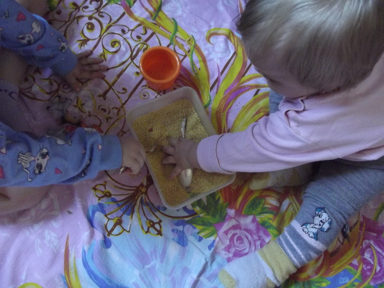 Моторика-опять же всяческие коробочки.Кроме крупы,шишек и тд,делаю еще из смеси муки и масла растительного,чтоб получилась сухая крошка.Типа такого.