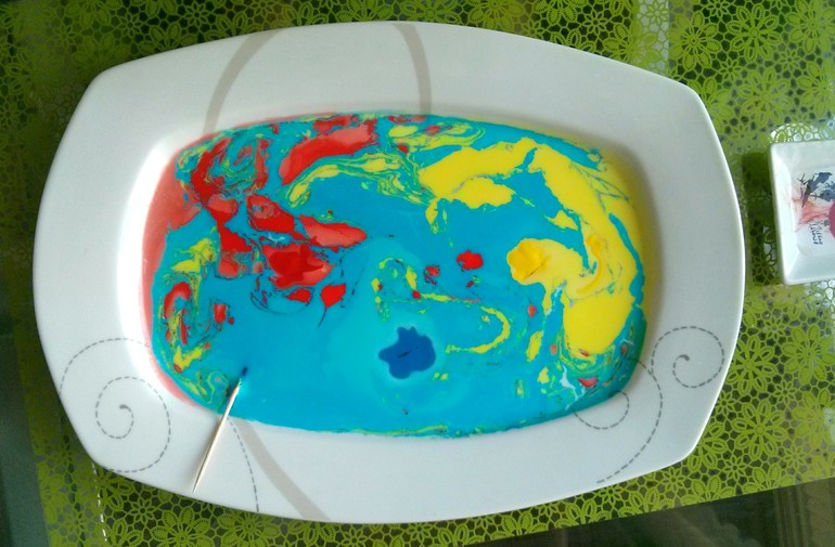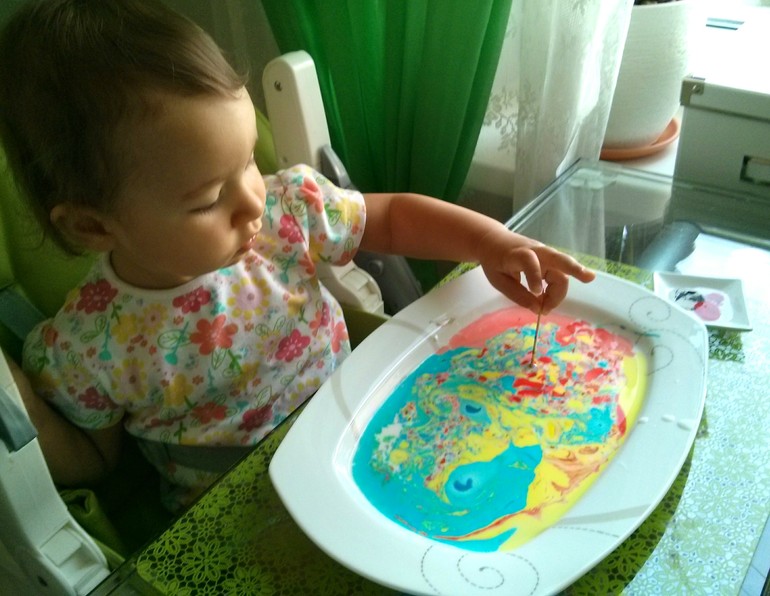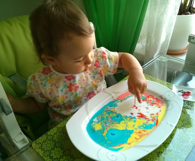 В нашем холодильнике обнаружилась пачка детского молока, у которого вышел срок годности. Мы и решили пустить ее в ход =) вылили ее тарелку, накапали гуаши трех цветов и решили поводить зубочисткой по всей этой прелести ...