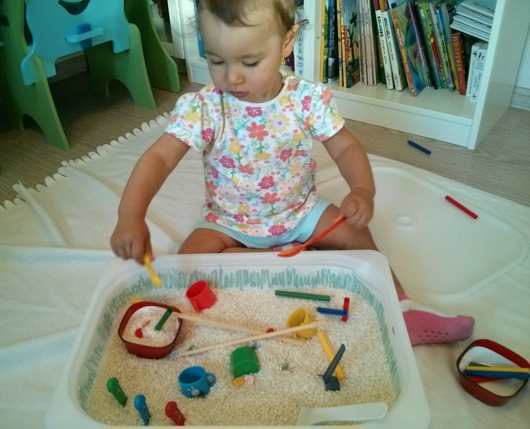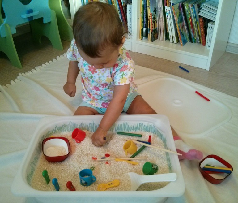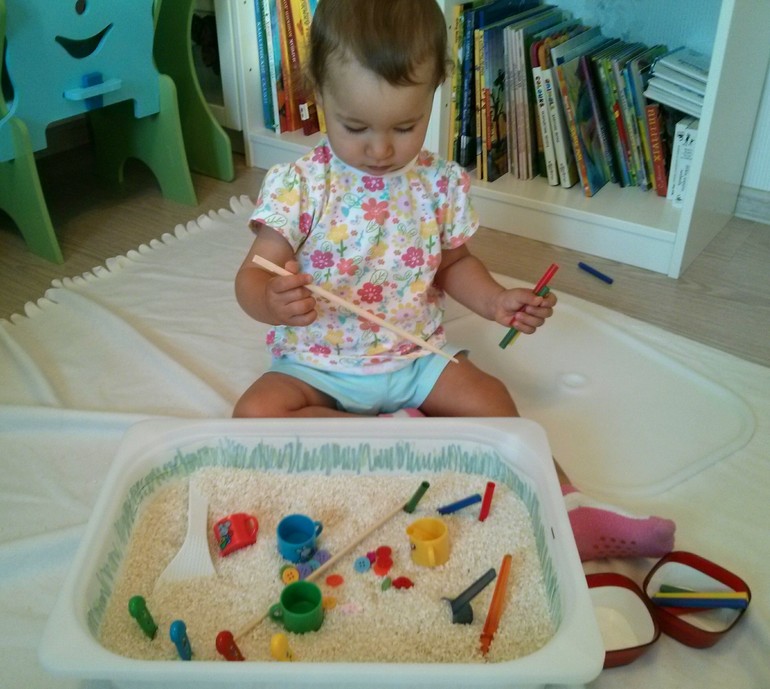 Но потом, с маминой фантазией произошел конфуз, мы просто решили попить чай из риса =)) попрятать пуговицы глубоко-глубоко, а затем дружно искали их ... Я показывала как дуть в трубочку, чтобы рис разлетался и образовывалась воронка, а Мирослава наблюдала и громко хохотала (сама пока отказывается) ...
