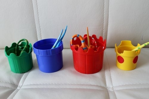 Как я уже писала,сначала мы использовали маленькие контейнеры с разным содержимым.Больше всего мне понравилась кукурузная крупа.Потом я сделала вот такую: