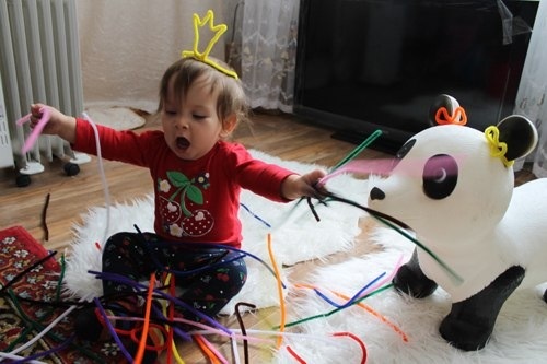 Здесь и разные текстуры,ощущения,цвета,игр с ними можно придумать миллион.Только начет проволоки хочу сказать,что хоть она и обтянута,но это все-таки проволока,и лучше в глаза ею не тыкать.Под бдительным контролем!Нельзя оставлять ребенка одного с этими предметами.