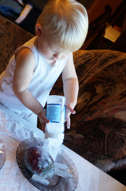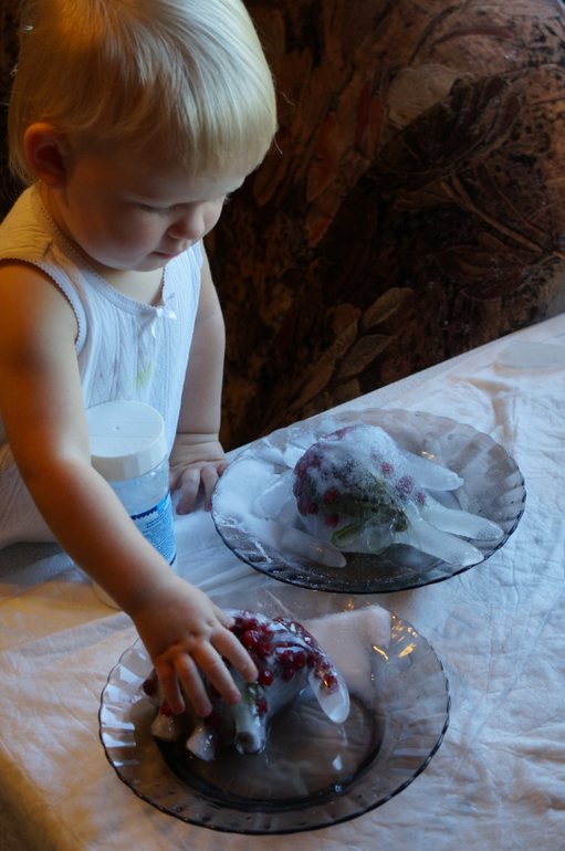 Развитие детей второго года жизниУ златовласки Ольги в дневнике есть чудная идея, как заморозить руки. Внутри резиновой перчатки с водой она помещала бусинки, поэтому они тонули и могли распределяться по пальцам, а я наморозила рябину, которая от легкости собралась на ладошках. Пальцы, кстати быстро отломились - больно хрупкие, но Машу очень увлек процесс посыпания льда солью, потом поливания кипятком, а потом уж и отковыривания ягодок. Лед на зубок мы попробовали, да и ягодки тоже. Так вот разнообразили свои художества на льду и игры со льдом .