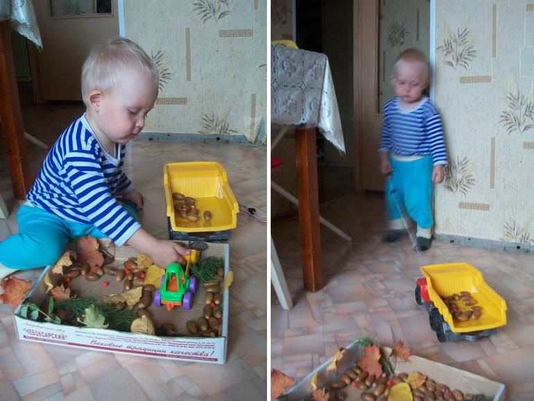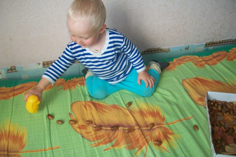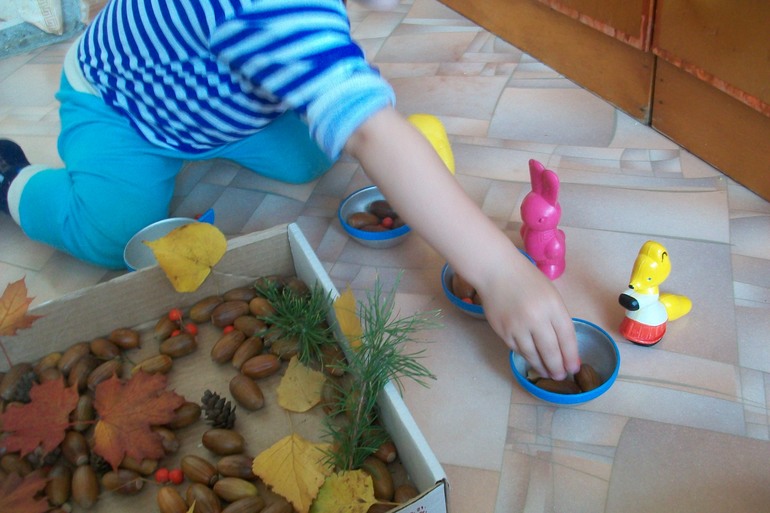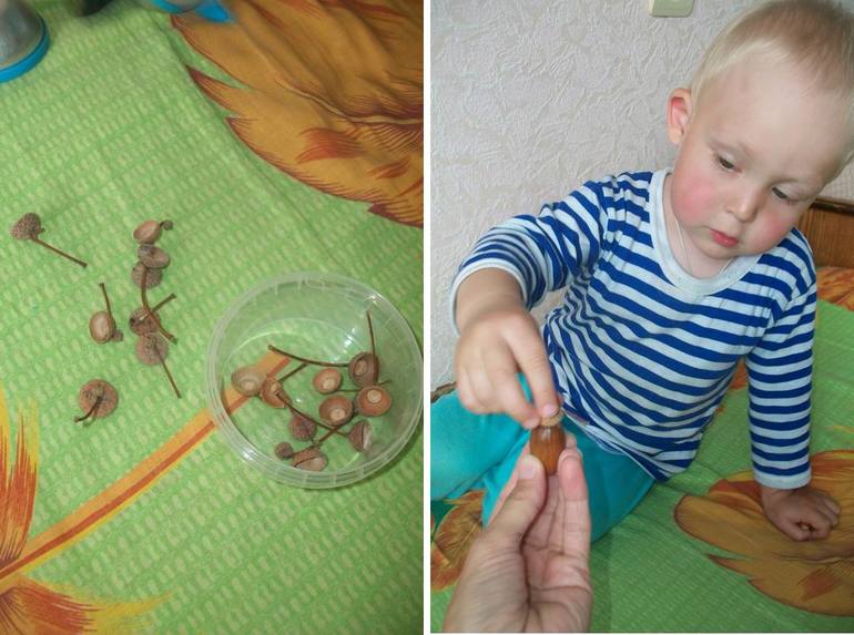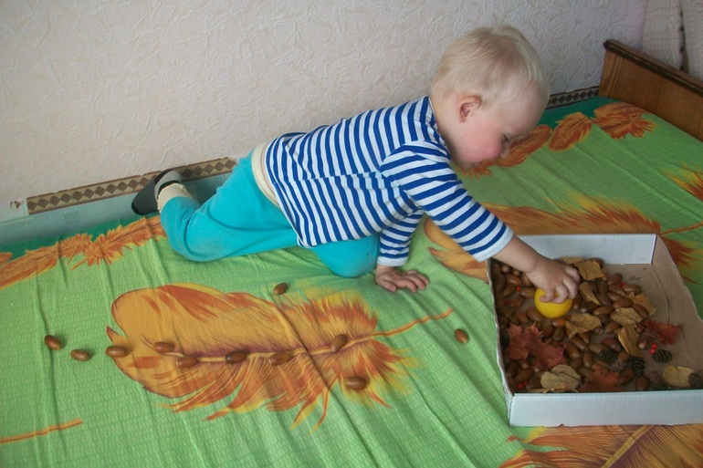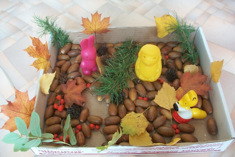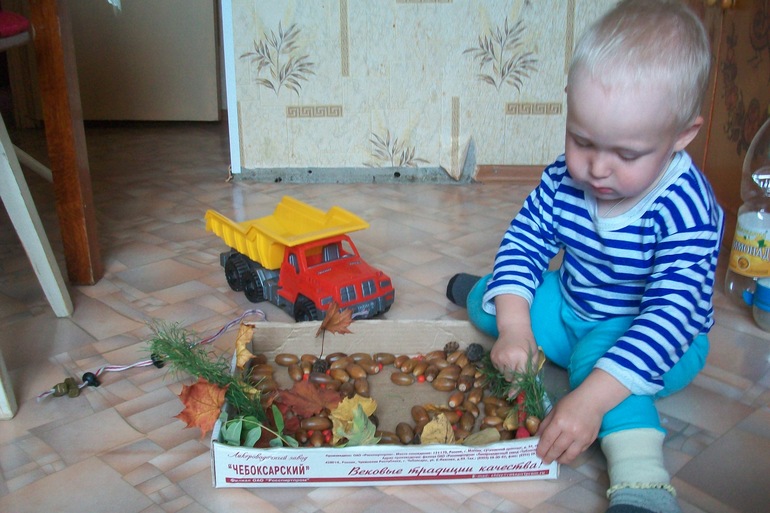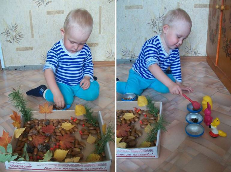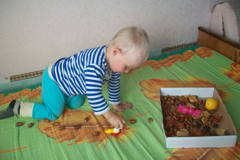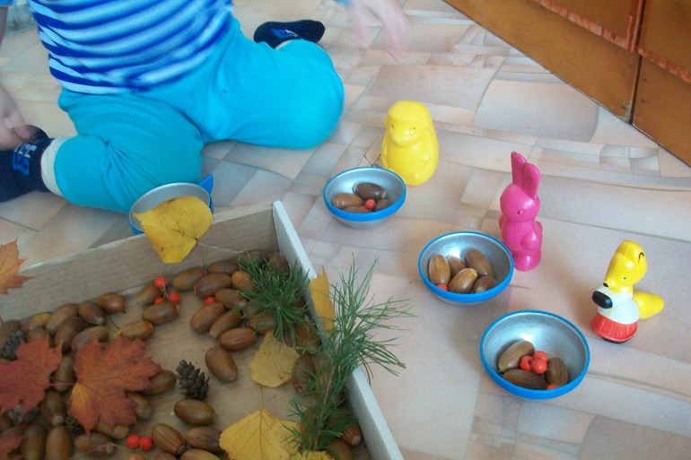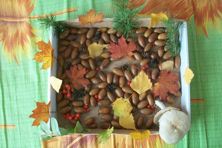 Изучаем окружающий мир (тематические занятия и циклы занятий)Пару дней назад в последние солнечные деньки сходили мы с сыном в рощу за желудями. Заодно я насобирала ему всякого осеннего добра: разные листочки, шишечки, рябинки, даже грибы нашла! После прогулки мы помыли желуди, и пока сын обедал, я приготовила ему осеннюю сенсорную коробку