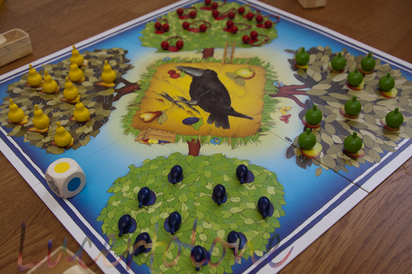 С цветами все понятно: красный - берем вишенку, желтый - грушу, зеленый - яблоко, синий - сливу. И так круг за кругом, пока не прилетит ворона, или пока не будут собраны все фрукты. Напомню, команда проигрывает, если пазл собран и на деревьях все еще остаются фрукты.