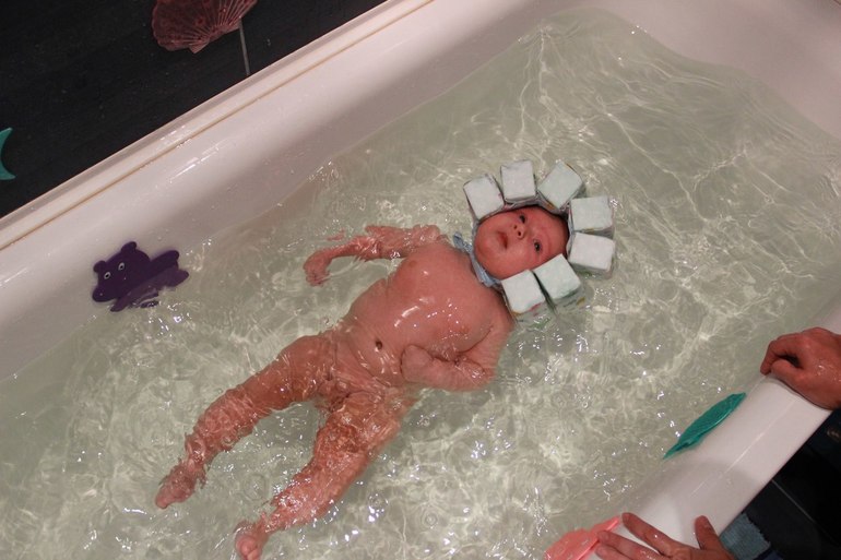 Про купание ничего не подскажу, потому что в большой ванне мы не любили плавать. Но от комментария не смогла удержаться — какой славный пупс в смешной шапочке))