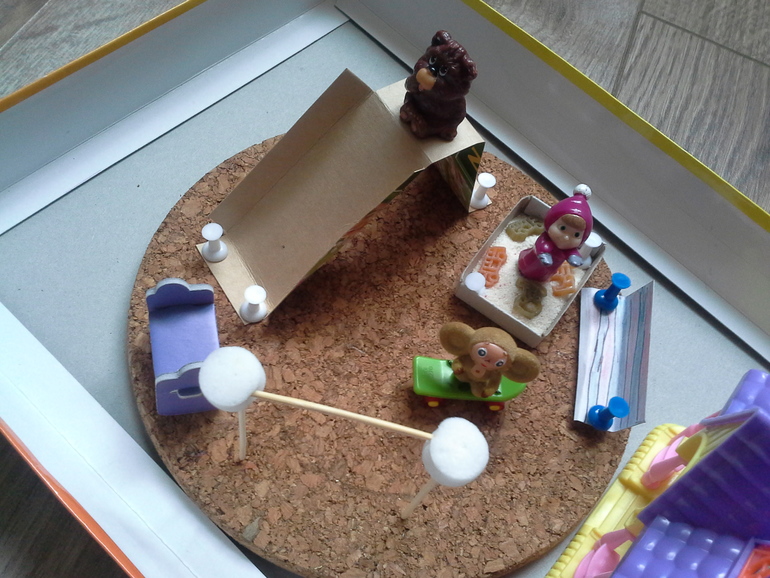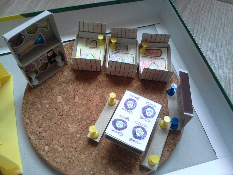 Почти всё я сделала из спичечных коробков; крепится всё посредством силовых кнопок или зубочисток. Я не стала делать детсад на бумаге. Так как на пробке всю мебель и антураж можно передвигать, менять местами, добавлять что-то новое. Для новых игр и театральных постановок. В голове уже есть парочка идей.По мере воплощения всё расскажу)))