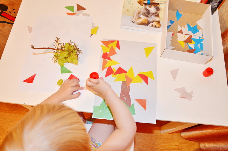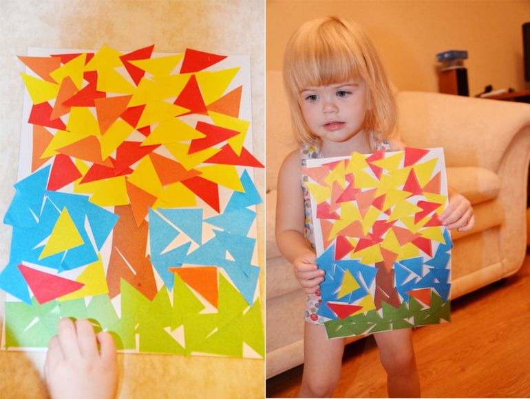 Что у нас дальше... Осенний витраж! Такие классные картины в этой технике получаются, плюс можно замечательно изучать геометрию. Просто берем много треугольников, квадратов и тд. одинаковой или разной формы и клеим! Героем нашего осеннего витража стал треугольник. Правда, до конца доклеивать пришлось мне. Но все равно Настя еще не раз просила сделать картину из цветных фигурок.