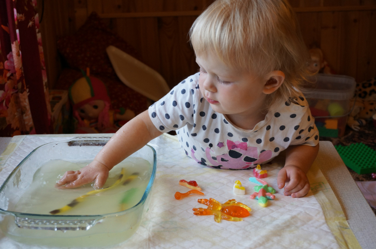 Развитие детей второго года жизниУ златовласки Оленьки была чудная желатиновая рыбалка, а у меня дома лежала коробка желейных конфет, которые мы часто используем с Машей для игр,а почему бы нам их не искупать? Мы сразу взялись за дело -купали, сушили, высаживали на берег и снова купали! Для сенсорики и моторики была удачная зарядка, тк конфетки стали очень скользкими, а яркий цвет и блеск радовали глаз, ну а про аромат и рай для обоняния и говорить не приходится.